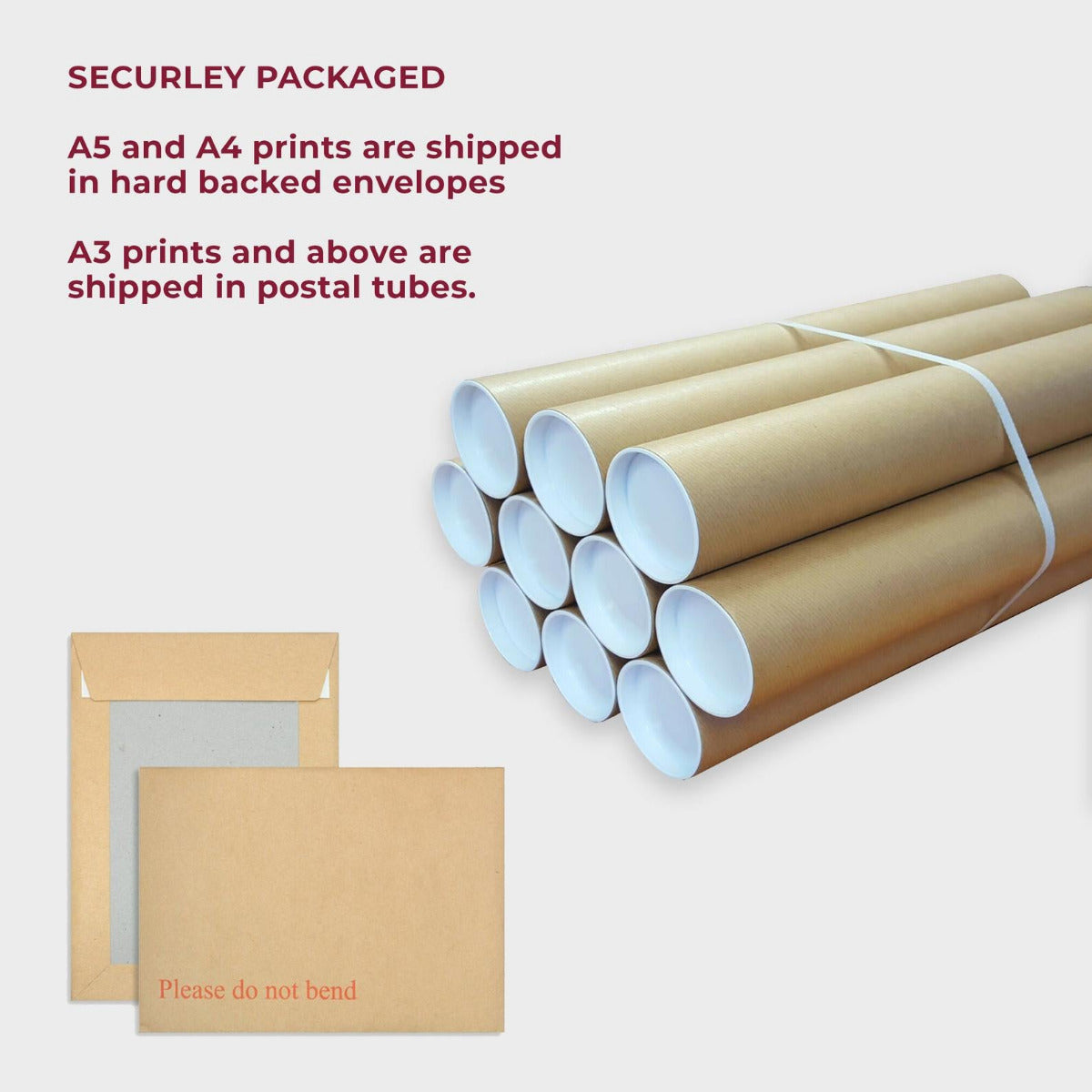 A4 and A3 Prints are shipped in hard board envelopes with stiffeners to secure prints and A2 and A1 Prints are shipped in premium postal tubes.